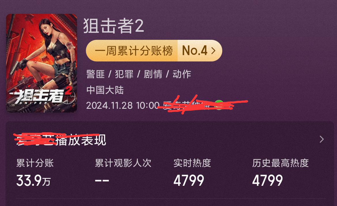 根据统计,《狙击者2》上映首日分账票房仅33.9万。