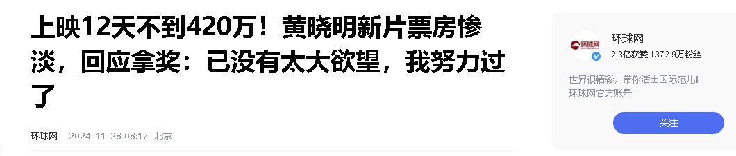 信息来源:环球网——上映12天不到420万!黄晓明新片票房惨淡,回应拿奖:已没有太大欲望,我努力过了