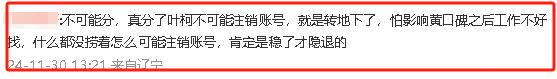 “不可能分,真分了叶柯不可能注销账号,就是转地下了,怕影响黄口碑之后工作不好找,什么都没捞着怎么可能注销账号,肯定是稳了才隐退的。”