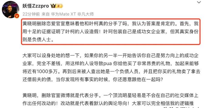 随后一名叫妖怪的博主发文表示,黄晓明删除官宣微博就是意味着分手了。