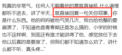赶上孩子心情好,父母晓之以情,动之以理地说了半天,孩子也只会回复一句,“关你屁事”。