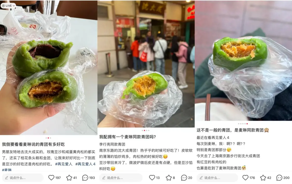 例如,节目中提到,李行亮为了给麦琳准备“惊喜”,特意从北京飞往上海,只为购买一盒青团。然而,当麦琳尝到的第一口青团不是“蛋黄肉松馅”,而是其他口味时,这份礼物并没有送到她的“心趴”上。此举激起了网友们的好奇心,究竟是什么样的青团能让李行亮不惜“打飞的”亲自去购买?有网友通过李行亮发布的Vlog视频发现,他购买的青团来自上海老字号品牌——沈大成。这一发现迅速在社交平台引起了热烈讨论,许多网友纷纷晒出自己购买的“麦琳同款”沈大成青团,并分享了品尝体验:“热乎乎的,好吃”“麦琳严选,完了真给她带到货了”……