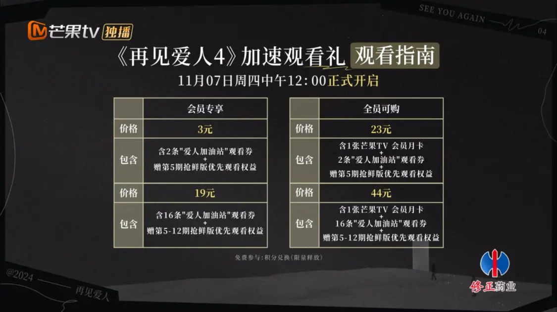随着《再见爱人》的热播,芒果TV还特别推出了“《再见爱人4》加速观看礼”。也就是说,可以在周五提前观看下一期的部门节目内容,即“抢鲜版”。每一期抢鲜版的价格为3元,或者一次性花费19元观看第5~12期的抢鲜版。