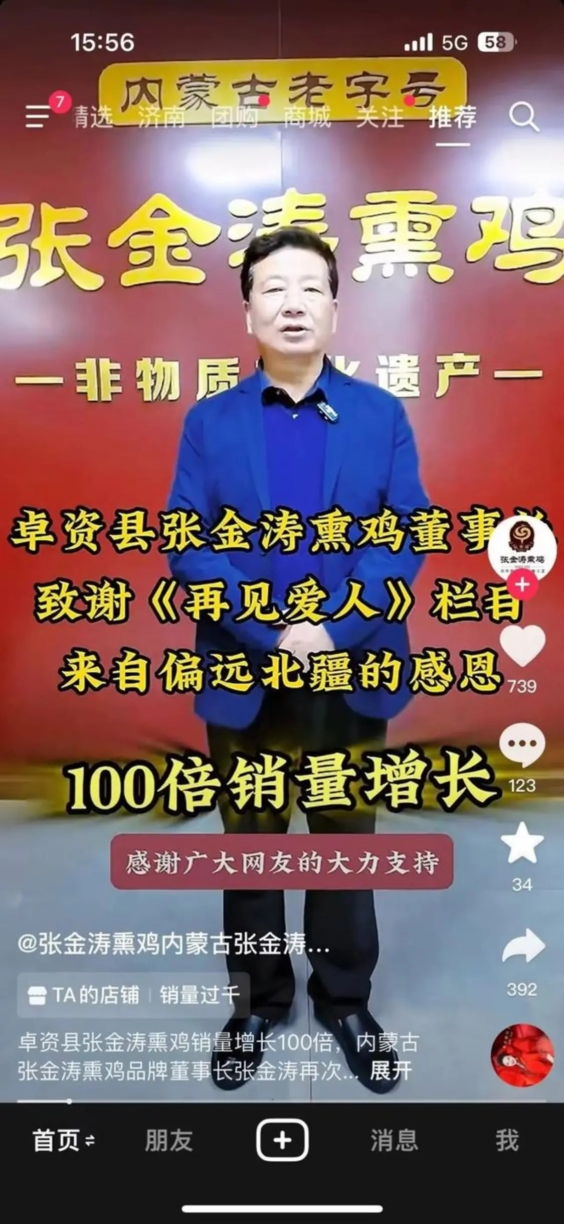内蒙古张金涛熏鸡有限责任公司负责人接受媒体采访时表示,“因为麦琳的事,最近熏鸡的销量可以说是突飞猛进,销量增长了大致100倍,原来一天可能卖几十、几百只熏鸡,现在每天已经能卖上千只。”张金涛熏鸡董事长还亲自致谢《再见爱人》节目带火自家熏鸡产品。