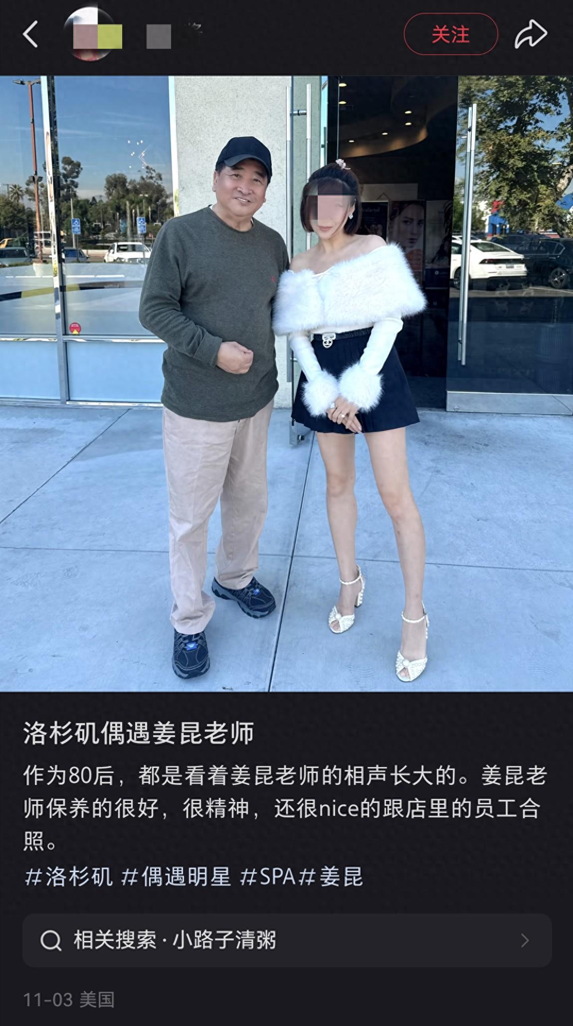11月初,有一位女网友在美国洛杉矶偶遇了姜昆,两人还进行了合影。