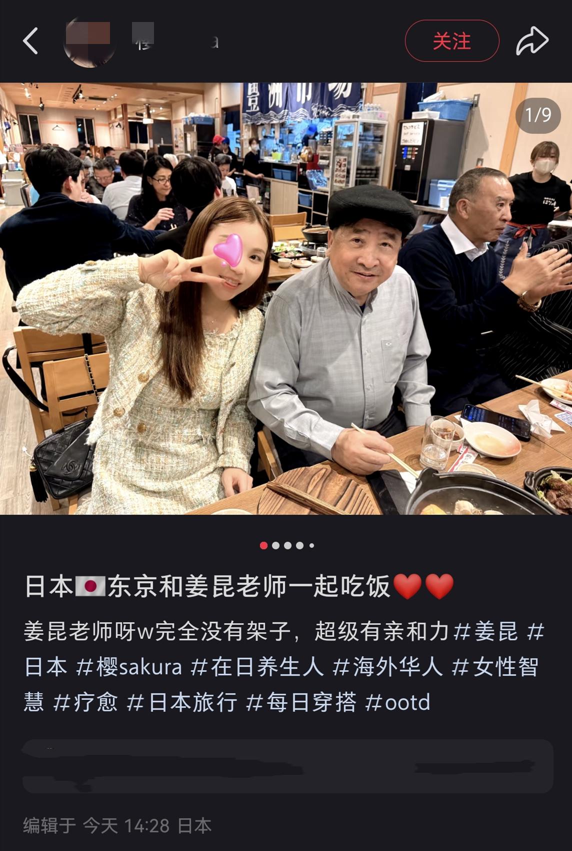 此外,这次女网友和姜昆偶遇,是在日本的一家餐馆里。姜昆和几位朋友在该餐馆聚餐。