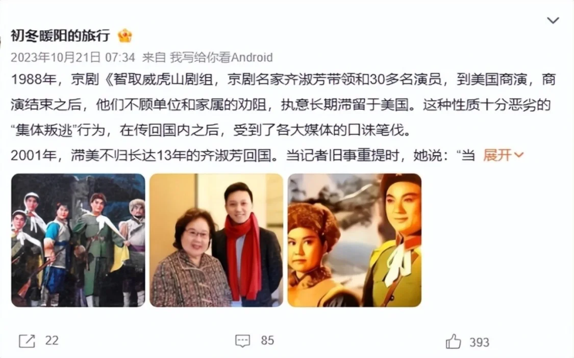 网络上有不少传闻指《智取威虎山》剧组30多人,80年代到美国表演时留在了当地。