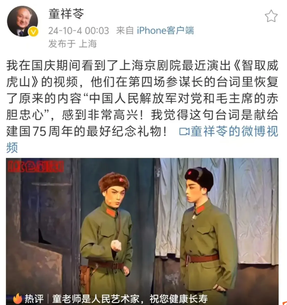 童祥苓老先生近年开通了个人账号,最后一次发文是10月4日,分享《智取威虎山》的视频。