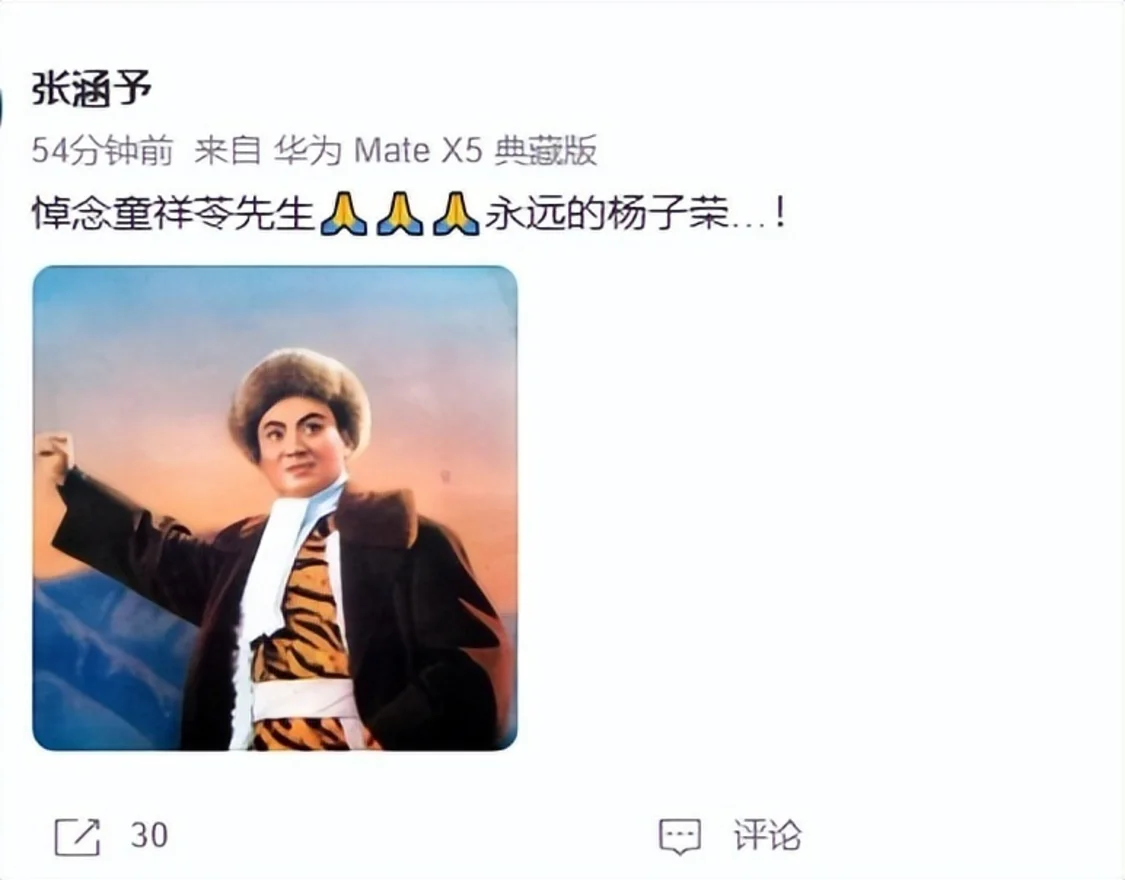 在电影《智取威虎山》扮演“杨子荣”的张涵予发文悼念: