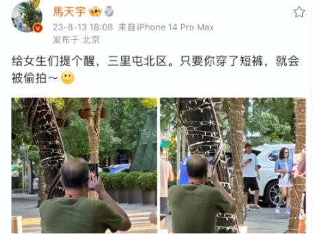 去年,他发了一篇微博,揭露在三里屯里偷拍女性的谢顶大爷。