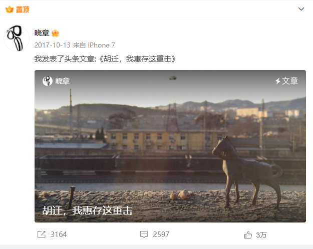 他的微博,只留下了在2017年写给导演胡迁的一篇悼文。
