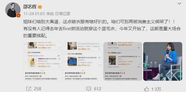 比如连夜发微博(1点还没睡),让姐妹赶紧远离消费主义陷阱。