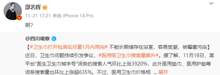 比如转发问题卫生巾的新闻,让更多人关注这个话题。
