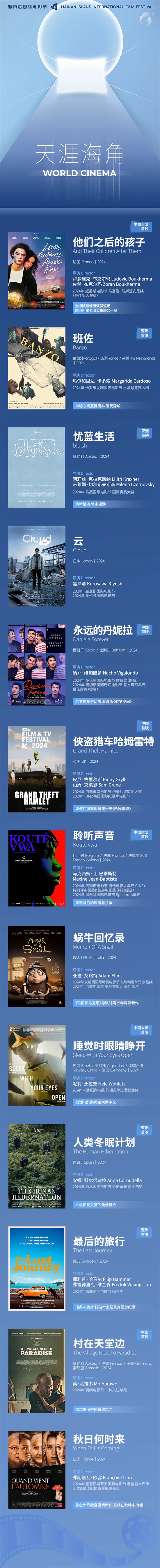 在银幕的召唤下,天涯虽远,故事如近,每一部影片都是一次思想与情感的探索,也是一扇通往广阔世界的窗。当灯光渐暗,银幕亮起,「天涯海角」片单开启,一场世界电影的绮丽之旅,邀您共赴。