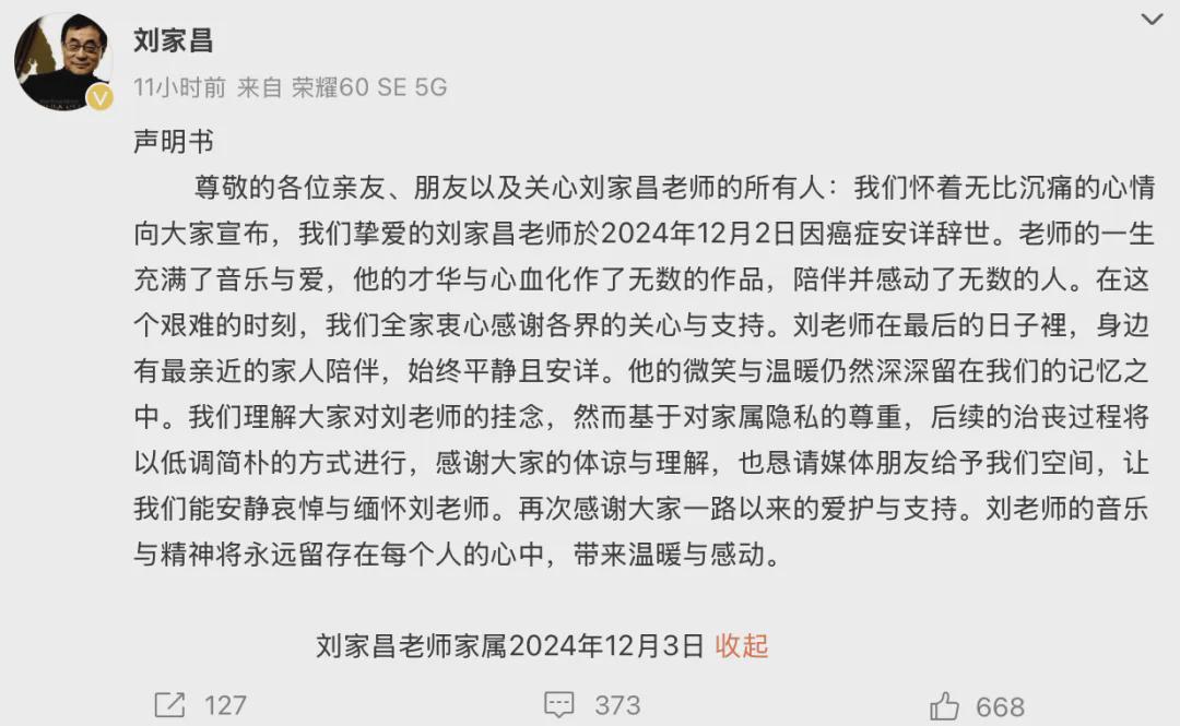 家属发文称,刘家昌在12月2日因病离世,在他最后的日子里身边有最亲近的家人陪伴,始终平静且安详,作为家属,也理解大众对刘家昌的挂念,但基于对家属隐私的尊重,后续的丧葬过程将以低调简朴的方式进行,也喊话媒体能够给家属们一些空间。