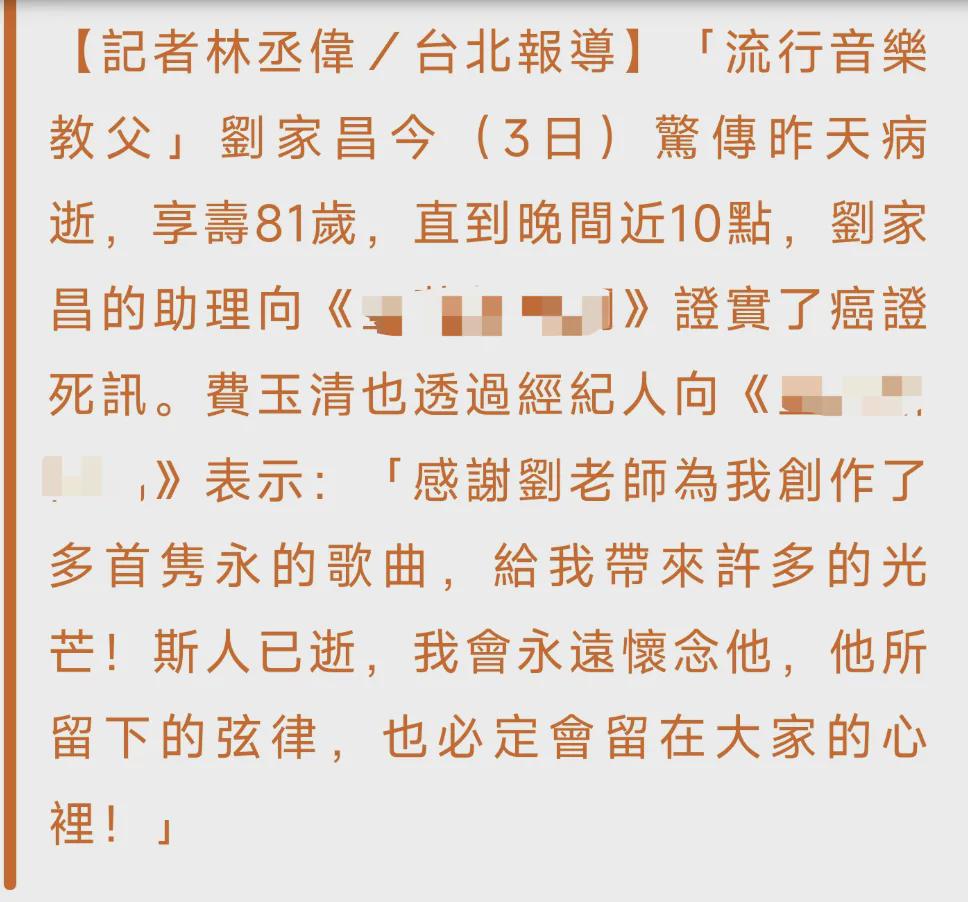 斯人已逝,希望刘家昌先生一路走好,也希望媒体能够给予他的家人更多的空间,不要再过多打扰了。