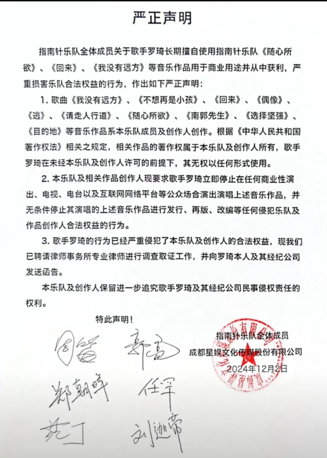 声明表示,被侵权作品由指南针乐队成员及创作人创作,相关著作权属于乐队及创作人所有,歌手罗琦在任何商业性演出、公开场合演出演唱乐队的音乐作品,进行发行、再版、改编等行为,系侵犯乐队及作品创作人的合法权益。