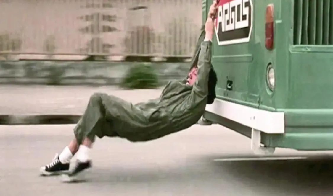 在《警察故事》中,他亲身挑战玻璃窗、公交车、商场滑杆等位置的高难度动作,将警匪片推向顶峰。