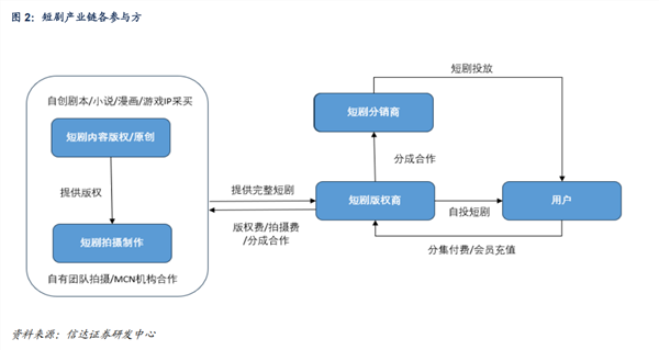 从盈利方式看,从短剧商业模式看,主要参与方包括:短剧内容提供方、短剧拍摄方、短剧版权商、短剧分销商和用户。在内容提供商提供 IP 或剧本后,由短剧拍摄方将内容拍摄成完整短剧,并通过授权或买断方式交付版权商,由版权商直接投放或与分销商通过分成合作方式投放给用户,用户的主要付费方式包括分集付费或会员充值。