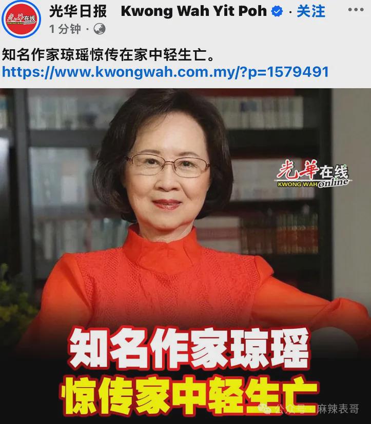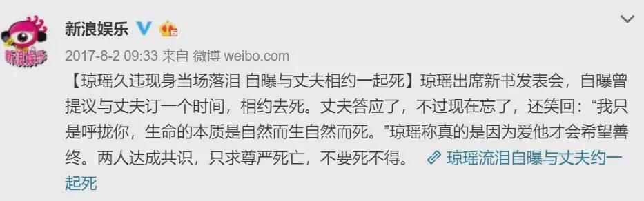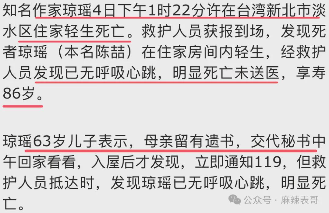 台媒报道知名作家琼瑶在家中轻生死亡。