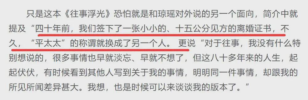 在平鑫涛去世前一年,林婉珍出了一本书《往事浮光》,出版社是皇冠出版社。说的就是那些年她、琼瑶还有平鑫涛的事。