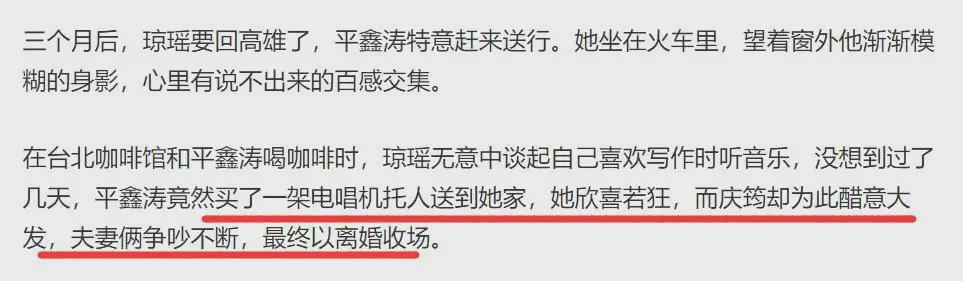 另外一个说法,说是因为琼瑶和平鑫涛走得过于近。庆筠接受不了,两个人最终收场。