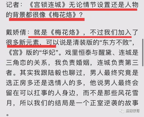 戴娇倩比较老实,接受采访时说《宫锁连城》无论情节设置还是人物背景就是《梅花烙》,不过他们加入了很多新的元素。