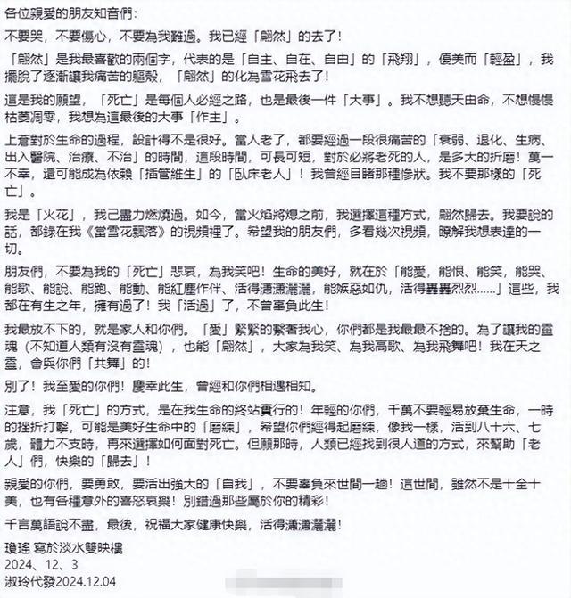 遗书中,大篇幅描述她选择轻生的原因,她无法忍受衰退与病痛的折磨,不愿成为身上插满管子的“卧床老人”,并多次强调让大家不要为她难过。