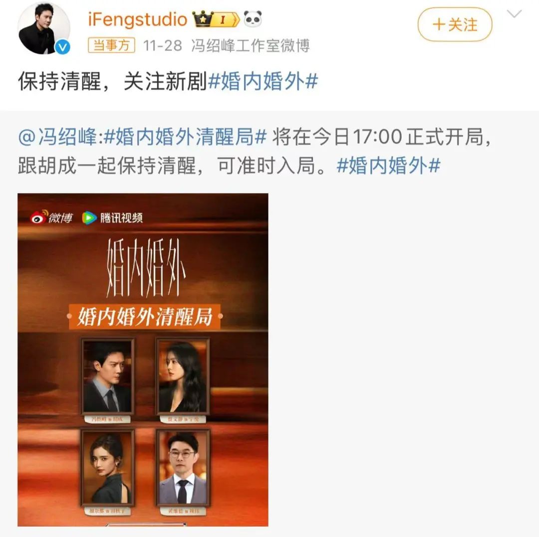 恋情曝光后,冯绍峰并未出面回应,倒是工作室趁机宣传了一波: