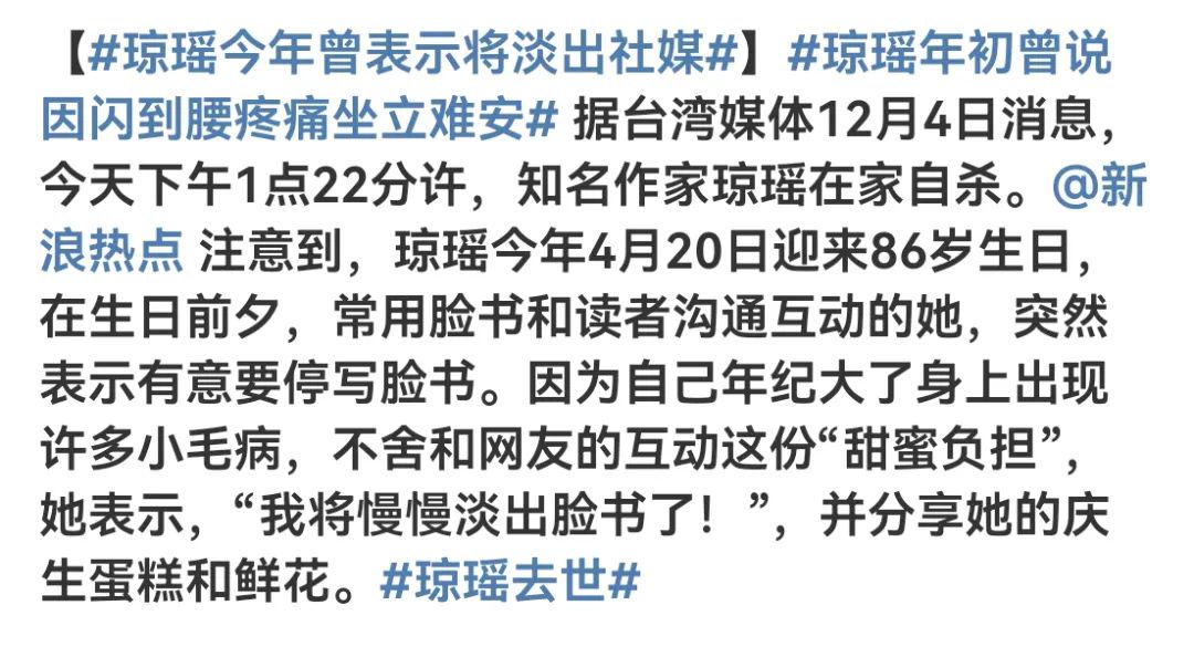 目前经过调查已经确认她是自杀的,这对于今年已经86岁的老人来说,应该是她真正自己决定的事,不存在什么内情。至于抑郁症,看看别人代发的琼瑶那封遗书就知道,能看出她的逻辑思维很清晰,把自己想说的话和想法都写进去了。最后她还不忘劝说,让年轻人别选择极端方式,要珍惜自己的生命。