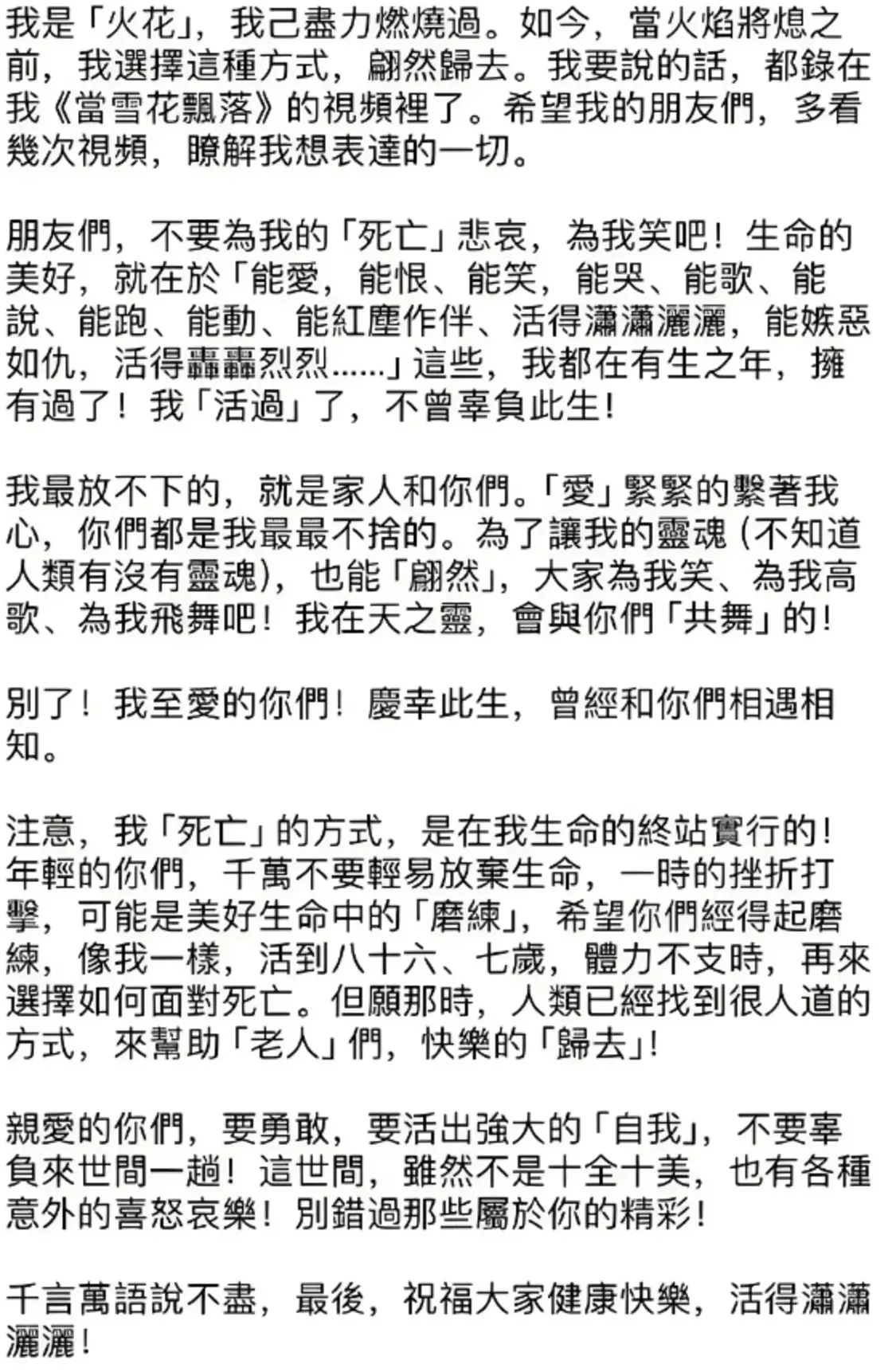 今天在看到这封“遗书”的内容时,我们真的很替她高兴,无论最后是什么原因让她选择结束生命,在最后时刻,回顾起这一生,她仍给出了正向的评价。对于她自己,她是满意的。