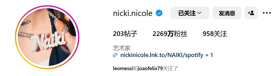 报道称,恩佐-费尔南德斯正在与24岁的阿根廷说唱歌手Nicki Nicole约会,她在社交媒体上有超过2200万粉丝。值得一提的是,梅西和菲利克斯也关注了她。