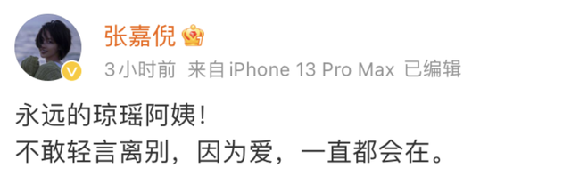 因出演《一帘幽梦》而爆红的女星张嘉倪,此次也发文送别琼瑶老师,要知道她去年因为去看疯马秀遭封杀,账号才解封不久,而且湖南卫视为了怀念琼瑶老师,再度播出了《一帘幽梦》,不得不说张嘉倪运气太好,都这样了还能播剧还是上星,可以说琼瑶去世,再次帮了张嘉倪大忙。