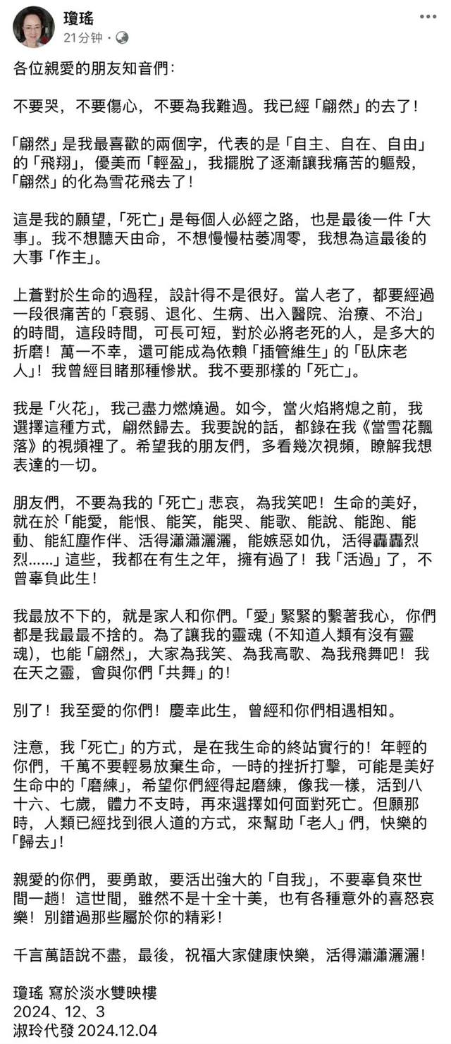琼瑶也给家人留了一封遗书,在其留下的文字里,琼瑶称不必为她哀伤,她已潇洒远去,挣脱了那渐趋痛苦的肉身束缚,如雪花般飘逝,这是她内心所求,毕竟死亡乃众生皆要踏上的路途,这份遗书写得很是坦然,甚至到了生命的最后,还在宽慰年轻人,一定要好好生活,不要轻言放弃自己的生命,等活到她那个岁数再来决定如何面对死亡。
