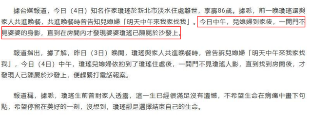 据报道称,琼瑶在去世的前一晚还与家人共进晚餐,并特意嘱咐儿媳让她次日中午来找她,第二天儿媳返家后,才发现琼瑶已于沙发上安详离世。