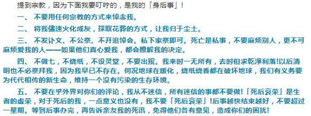 关于后事操办,早在多年前,琼瑶就叮嘱家人一切从简,不论她生了什么重病,都不动大手术,不插管,不住加护病房,包括任何的急求措施,要让她没有痛苦的死去,为此就不难理解琼瑶自杀的行为了,她要对自己的生命作主,亦是不希望拖累家人。