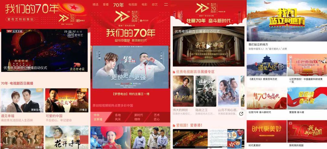 国庆期间,四大网络视听平台以纪录片、综艺节目、电视剧为重心进行了特别版块编排。比如,爱奇艺《我和我的祖国》《加入我有时光机》《本色》等;腾讯视频《见字如面4》《宵夜江湖》《佳节》等;优酷《这!就是灌篮2》《伟大的细节》《我在颐和园等你》等;芒果TV《功夫学徒》《变形计19》《遇见天坛》等。