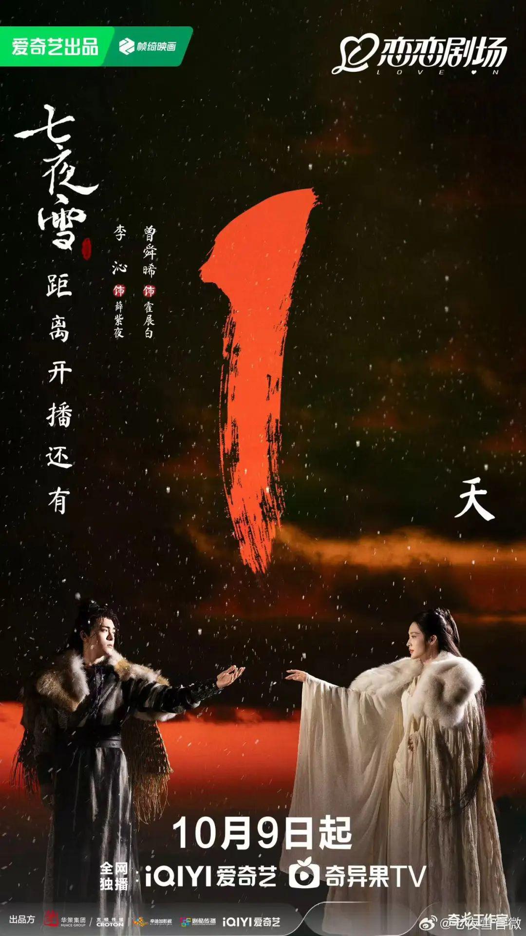 由辛迪加影视、剧酷传播、爱奇艺联合出品,任海涛、梁胜权、李伟基执导,李沁、曾舜晞领衔主演的古装情感剧《七夜雪》官宣定档,将于10月9日在爱奇艺独播。剧集根据沧月创作的同名小说改编,讲述了霍展白为友人之子求药,结识了药师谷谷主薛紫夜,各有执念的二人从争锋相对,到成为惺惺相惜的知己,却因各自背负的责任而难言爱意,最终天人永隔的故事。