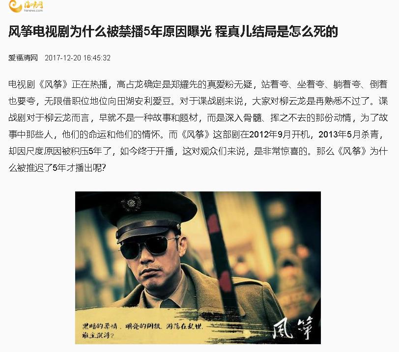 海峡网——《风筝电视剧为什么被禁播5年原因曝光 程真儿结局是怎么死的》2017-12-20新京报——《《风筝》 直面“潜伏”的撕裂之痛》2018-01-11新周刊——《《潜伏》十年,它还是最好的谍战剧》2019-04-09