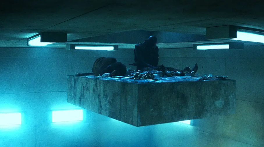 换句话说,原本饥饿站台大开大合,所映射的硬核“阶级问题”设定,导演将其完全抛弃,转而另辟小道,用抽象画面玩起了浅薄没劲的自我表达。