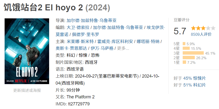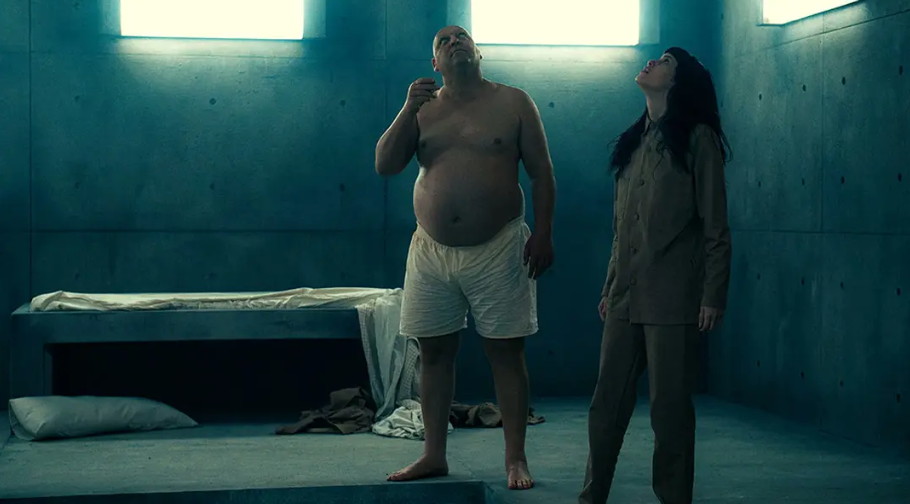 一座333层的垂直监狱,每层两个犯人。载满食物的平台,每天会从第一层开始下降至底层。