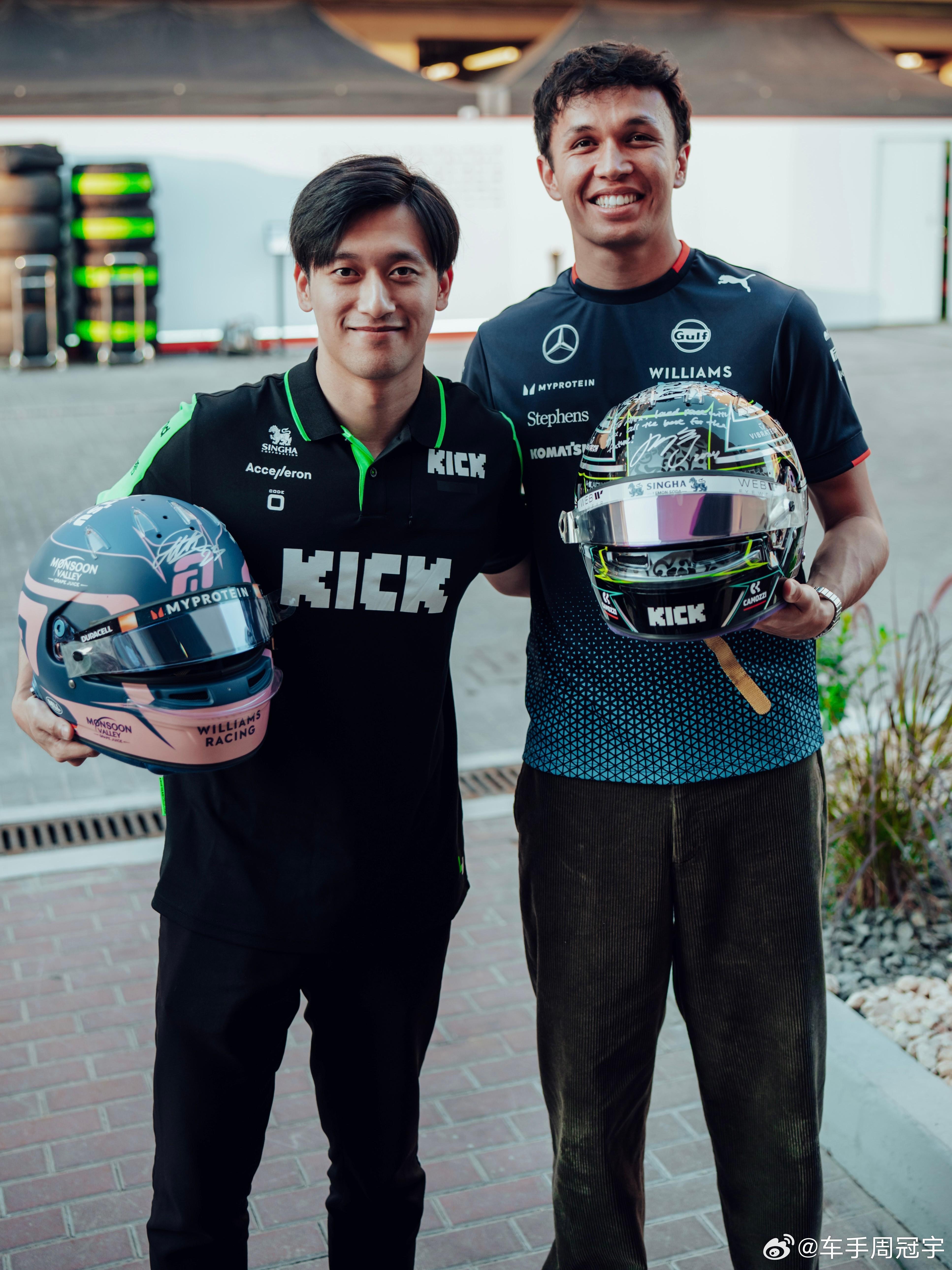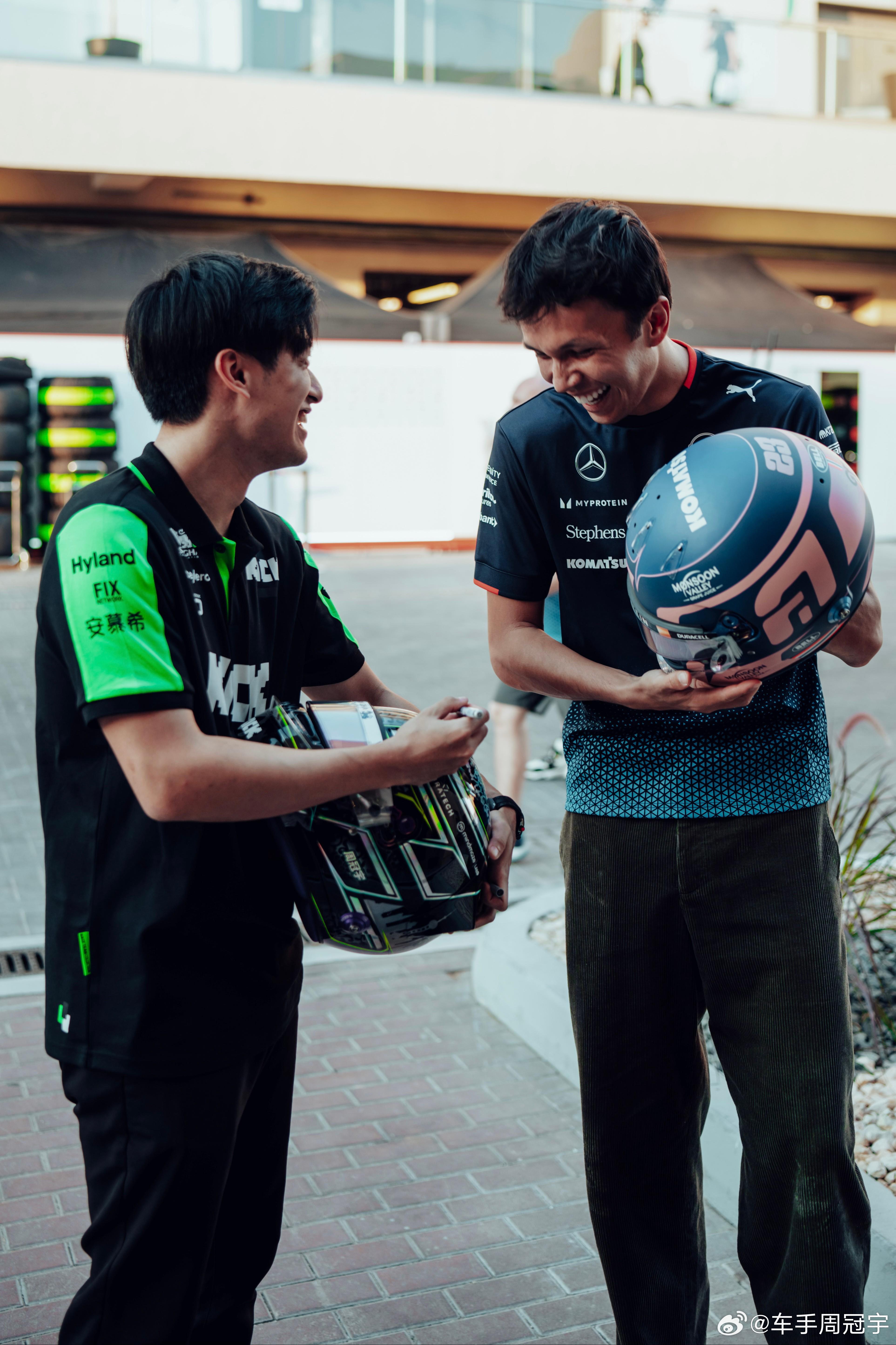 北京时间12月6日,中国车手周冠宇更新社媒,晒出了与威廉姆斯车手亚历山大-阿尔本交换头盔的照片,并配文:和Alex互换头盔!想学中文我可以教你。