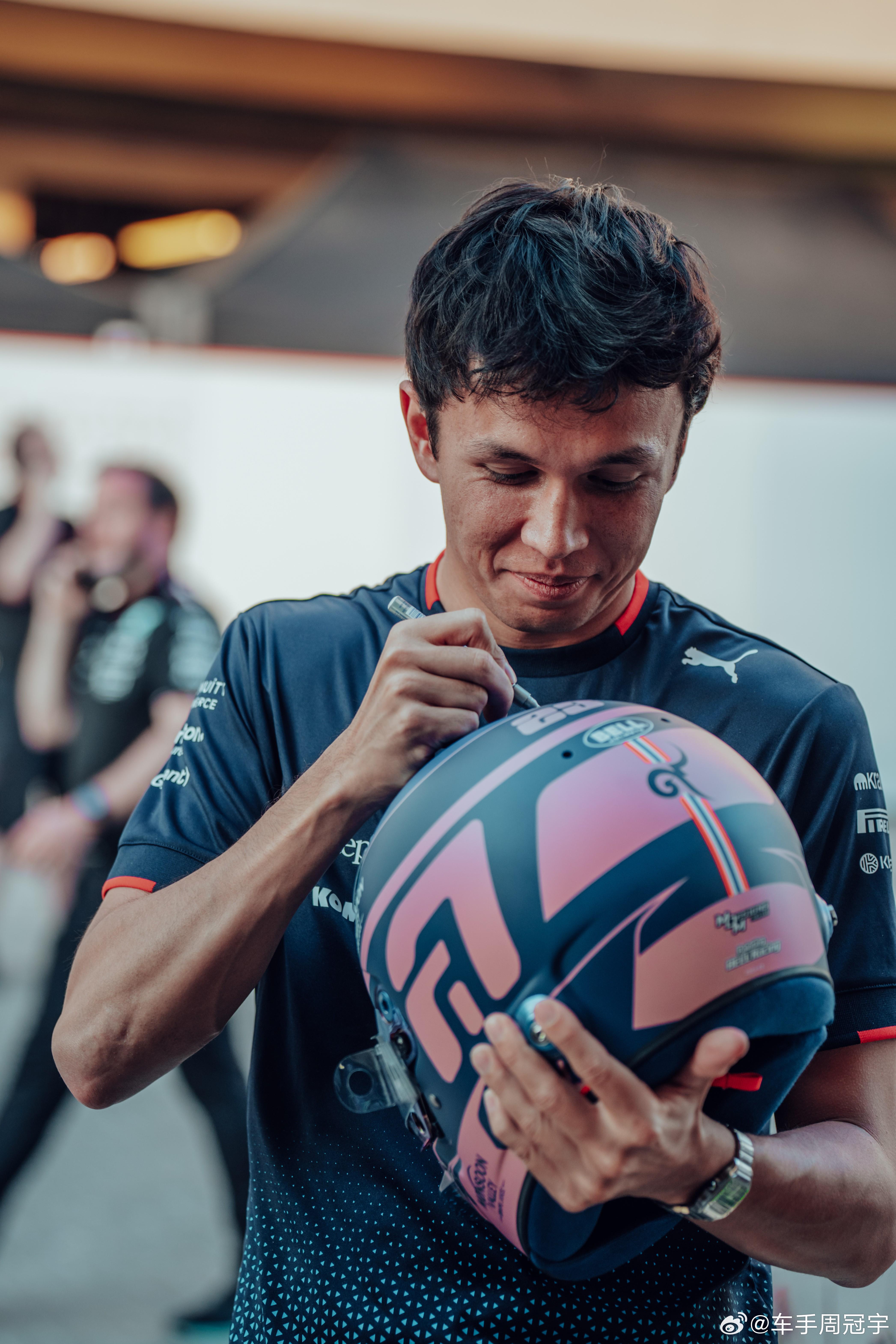 周冠宇与阿尔本交换头盔,并教会后者第一个中文词语“挣扎”