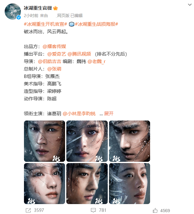 《冰湖重生》官宣开机,由两大一线平台播出,耀客传媒操刀。