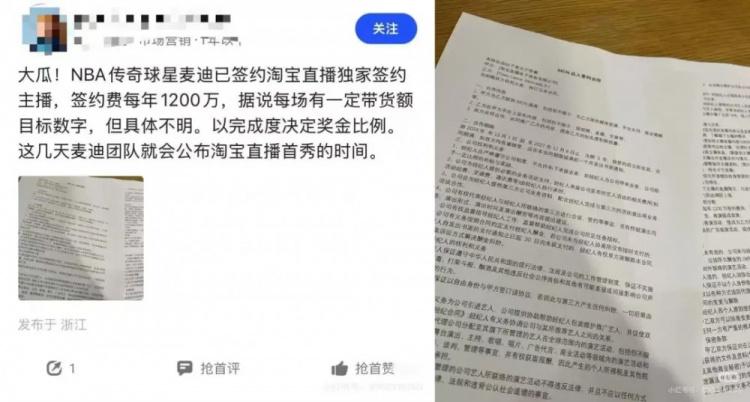 蓝鲸新闻:麦迪与淘宝签订3年直播带货合同 每年签约费1200万