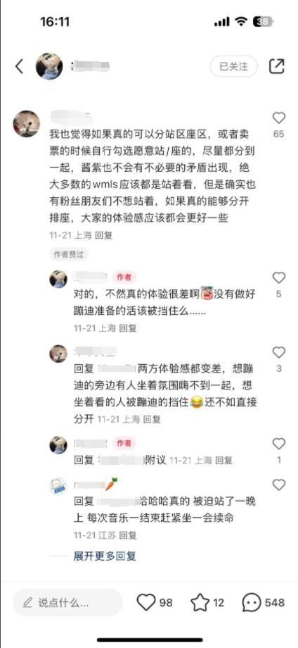 “许愿演唱会站票坐票分区卖”是李女士对于此次演唱会之后的感慨,这种想法也得到了部分网友的认同。乐迷小邹建议,票务网站在售票时推出一个让观众自行选择是否需要强互动的小调查,把想安静听歌的观众和想感受演唱会现场热烈氛围的观众区分开再排座开票,可能两方的观演体验都会好很多。