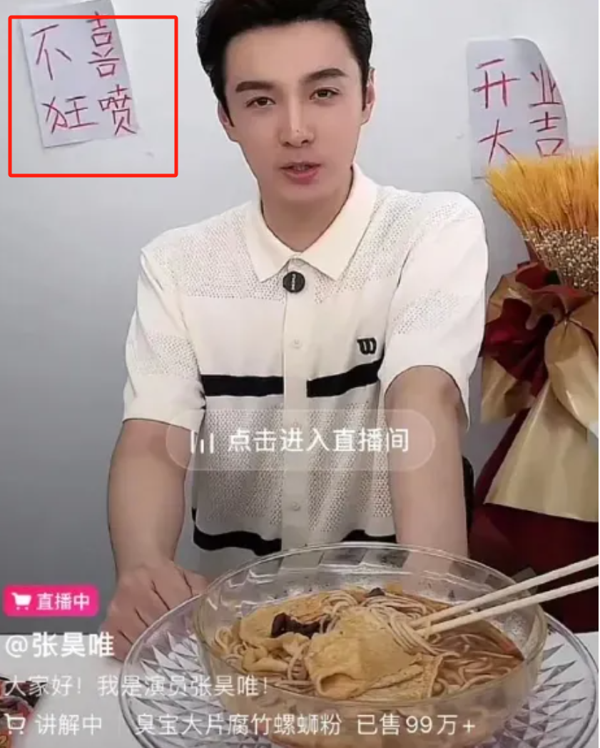 开启了直播带货,还在背景墙上贴“不喜狂喷”等字内涵自己。
