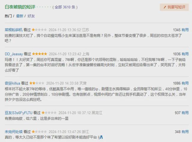 《白夜追凶》续集《白夜破晓》原本以为会像《唐诡2》那样有惊喜,结果七大案子都狗尾续貂,并在大结局中强行把男主关宏峰写死,沦为像周一围版《大唐狄公案》那样的大IP雷剧,是可忍孰不可忍?理应唾弃!