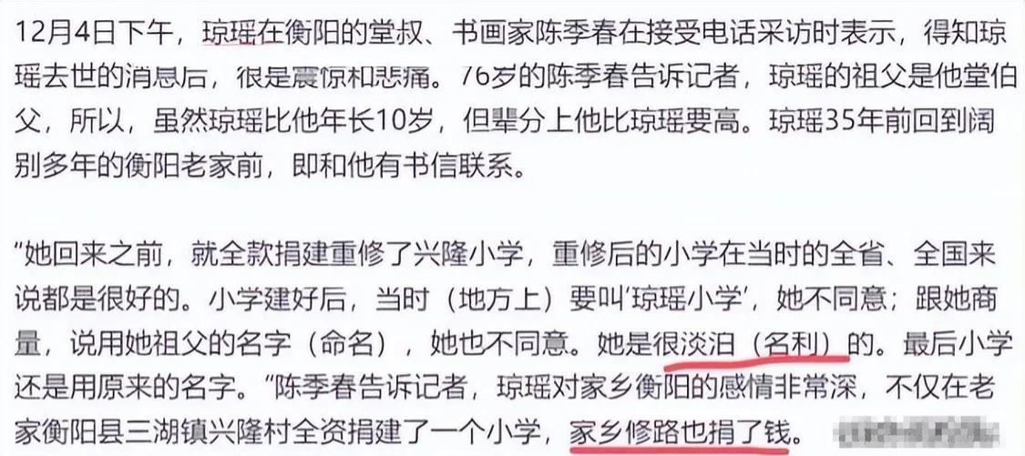 堂叔表示琼瑶在35年前曾回祖籍见亲戚,还修建了兴隆小学。她很淡泊名利,当时还不让地方取名“琼瑶小学”,甚至老家的路也是琼瑶捐钱修建的。