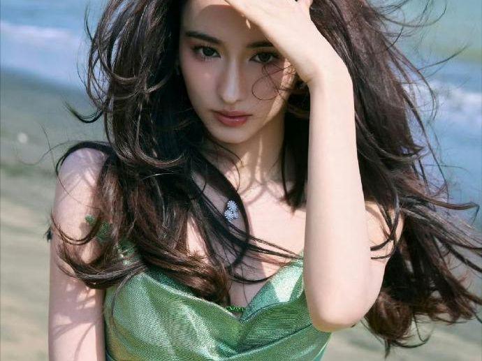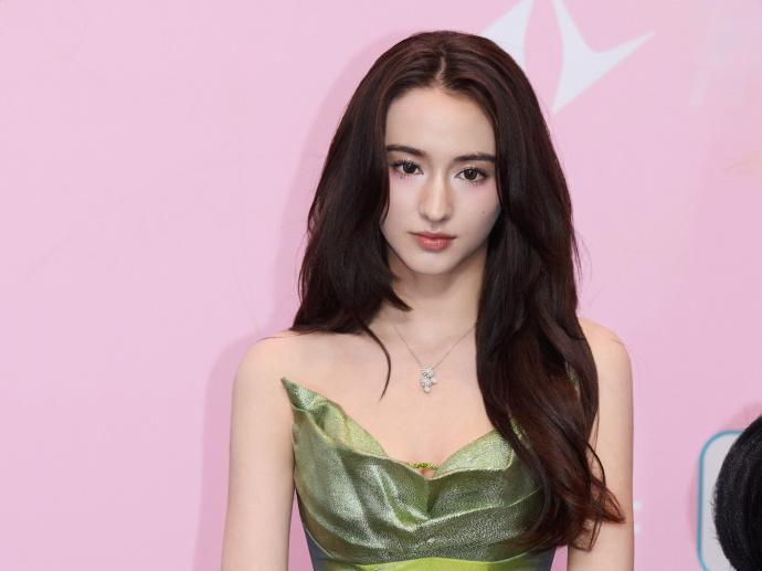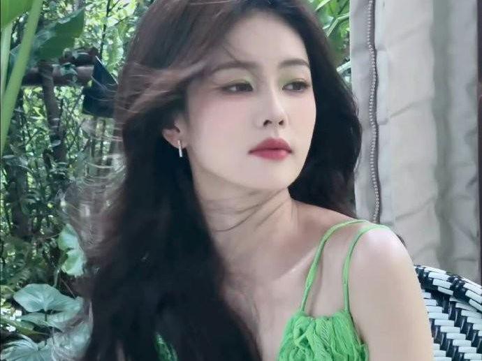 李宛妲绿色长裙,清新自然,五官精致,混血感十足。